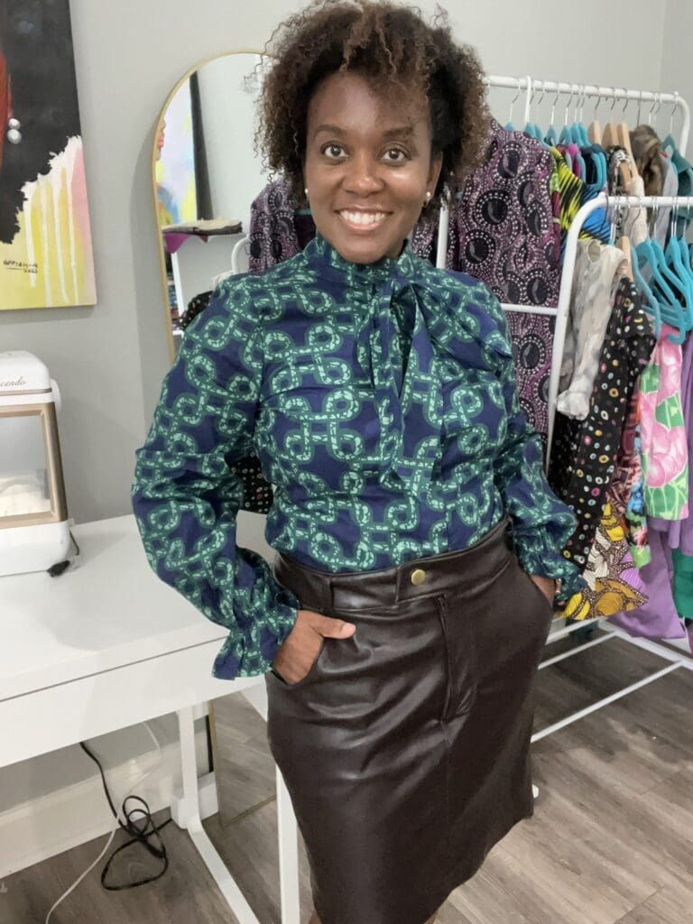 My first purchase was a simple button-up women’s blouse, Akinyi. It shipped to me in plain packaging. I had to press it out, but I was more than pleased once I did. A well-crafted placket hides the buttons, and the material is superbly Ankara (Dutch wax). You all know how much I love to sew with Ankara fabric. I’m always a little put off when I buy a garment that claims to be made with this technique, but the underside demonstrates that it was made with the knock-off, low-quality technique– not my experience with D’iyanu. So I am happy to do a D’iyanu review, knowing the excellent quality blouse I received.