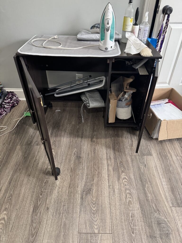 For years, I was ironing on a Saunders expandable wheeled sewing table, covered with a makeshift ironing pad. It was a less-than-ideal situation. First, it was the wrong height and much too low, creating an ergonomic nightmare for my back. Secondly, as I pressed with steam, despite the protective pad, moisture eventually cracked the surface of the table, making it uneven. And let’s be honest, traditional ironing boards are flimsy and small—they simply can’t handle my creative intensity! I needed a real solution: something sturdy, at the right height, with built-in storage.