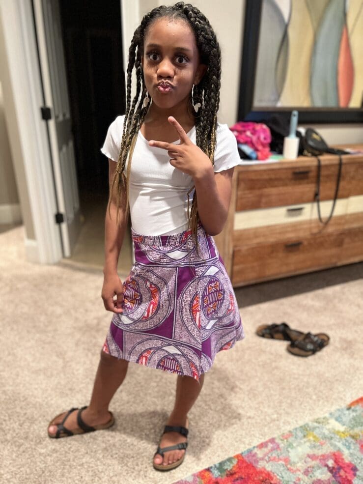 The second child, on the other hand, was always in the studio. Unlike her older sister, she sometimes slept under the sewing table and often made doll dresses from mommy’s stolen fabric scraps. So, it should have come as no surprise to me that she wanted a skirt for the opening movie night of Wakanda Forever. In honor of the late Chadwick Boseman, a Howard University alum and the star of the all-star cast, Black Panther fans were asked to dress in white to mourn the loss of the king. Other dress alternatives were purple regal or Ankara.