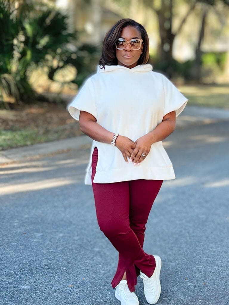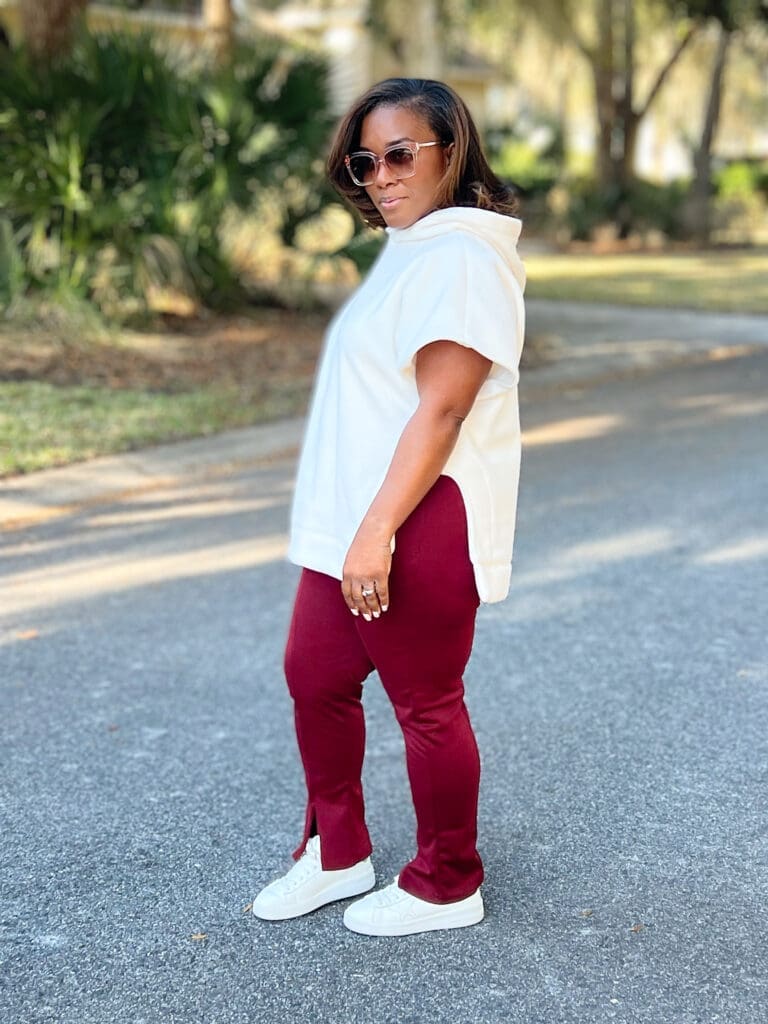 I regrettably didn’t make any adjustments to the Simplicity 9636 top, but it is supposed to be oversized. The issue here again is that I’m super snack-sized. The fact is, oversized isn’t always my best look. In terms of the pants, I removed approximately seven total inches from the length and could have removed a little more. I also did not make a crotch adjustment, something I may do next time.